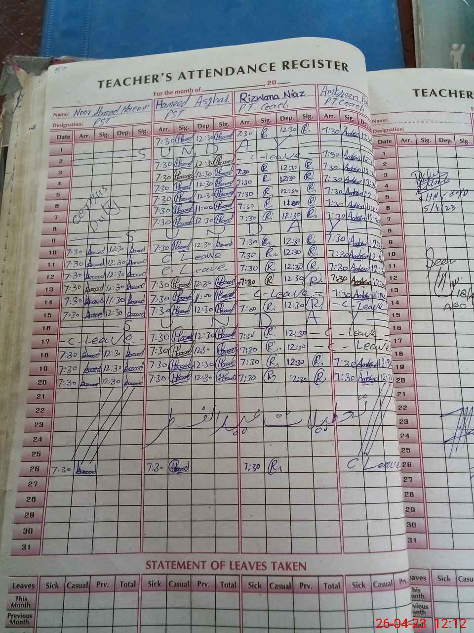 | Leave | Duty | Absent | Maternity | Medical | Ex- Pak |