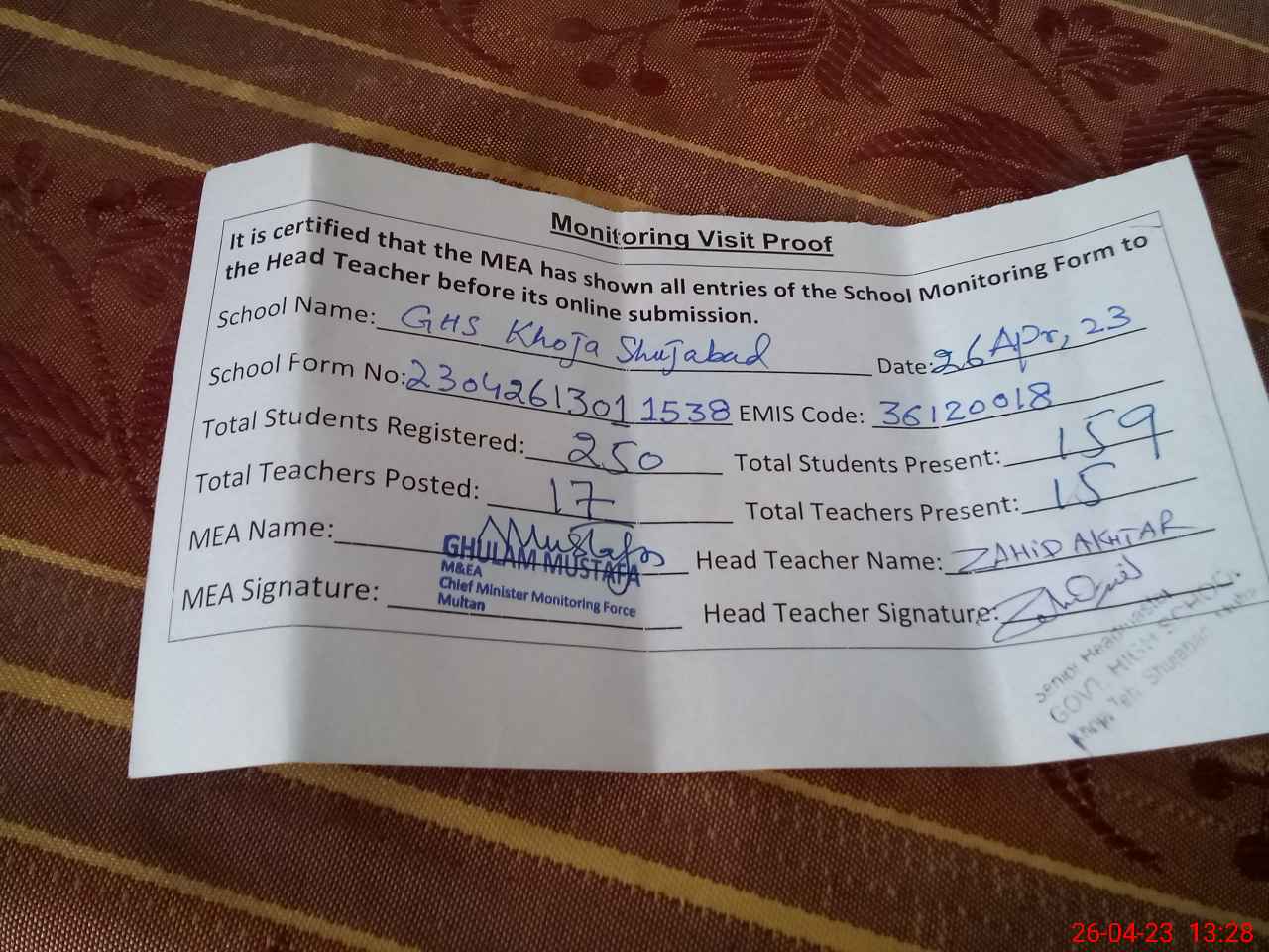 | EMIS Code: 36120018 | Name of School: GHS KHOJA P.O. KHOJA TEH. SHUJABAD DISTRICT MULTAN | |||