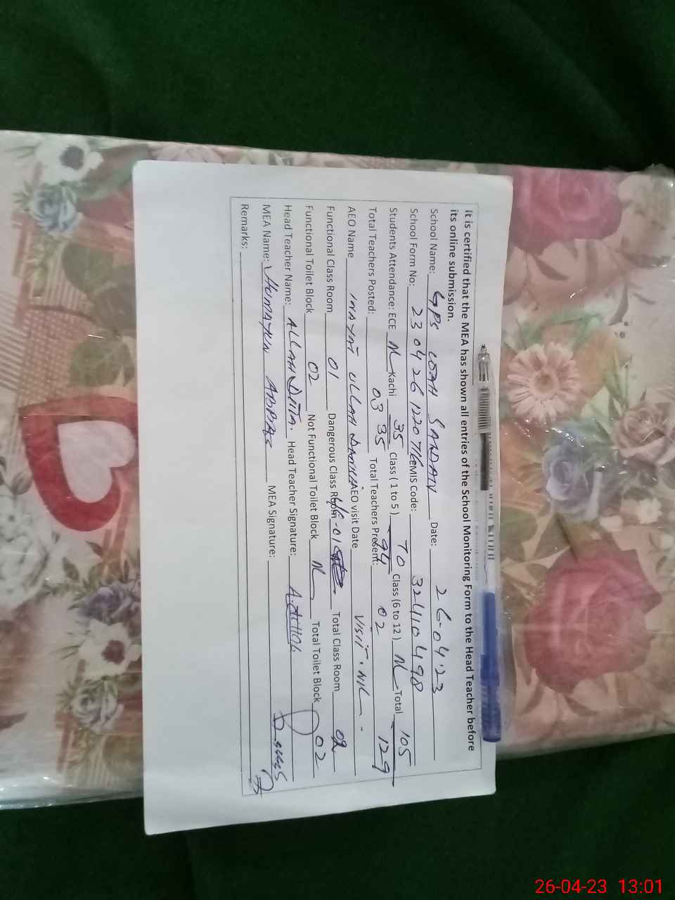 | Certified that this School was Inspected by the Undersigned MEA/DMO Today and the Information Stated Above is as Per Record. | |||||
