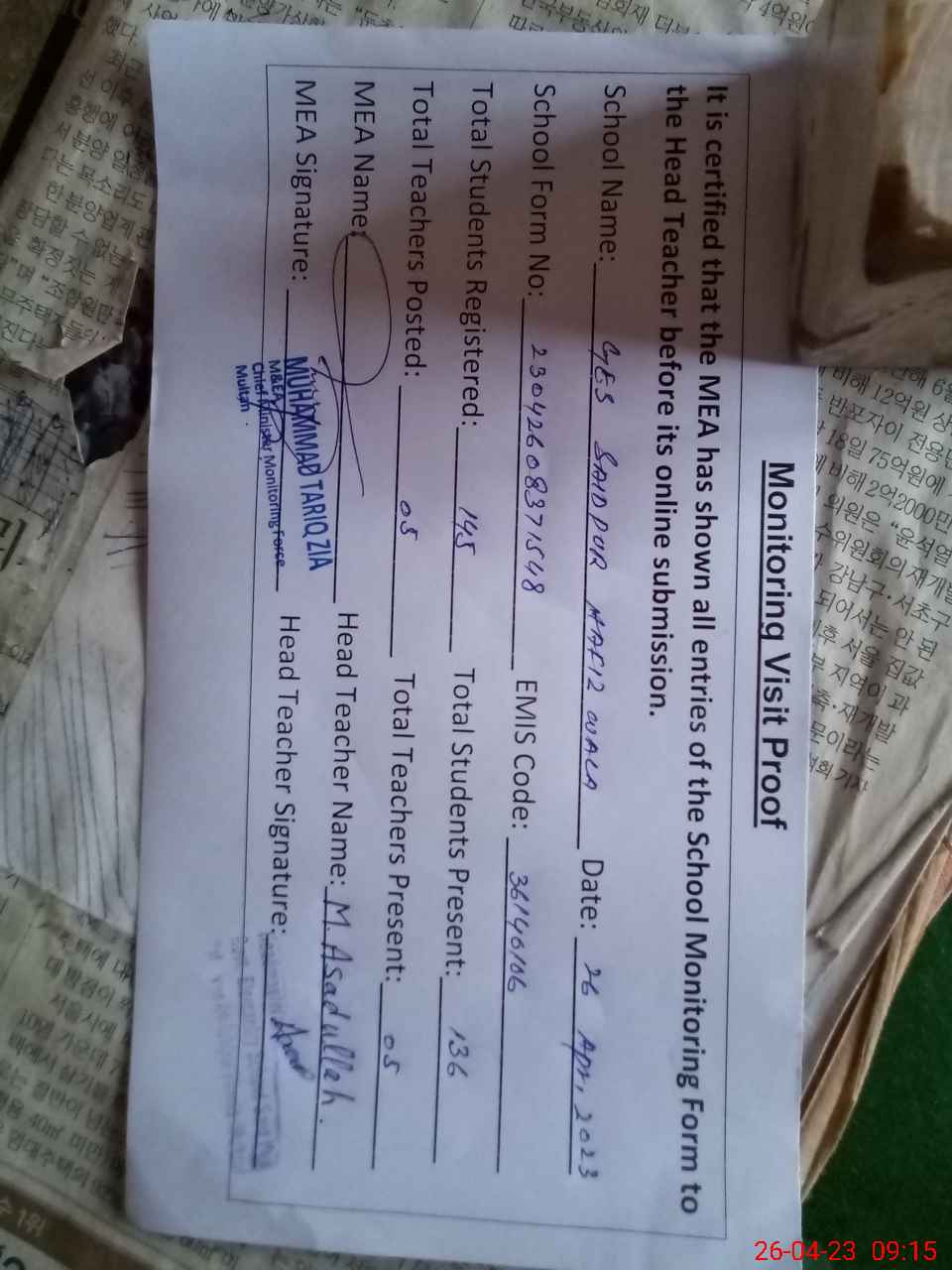 | Attendance Register | Head Teacher | MEA with School | Visit Proof |