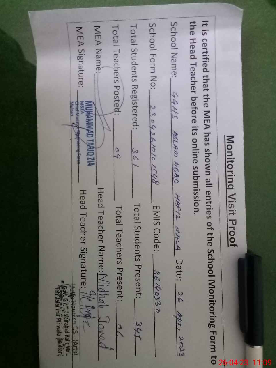| Attendance Register | Head Teacher | MEA with School | Visit Proof |