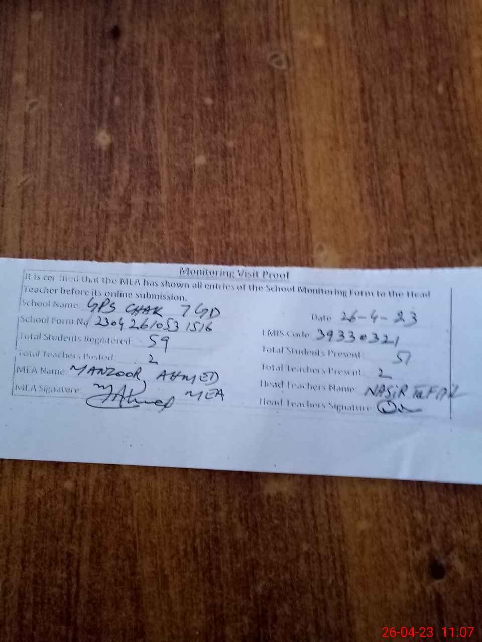 | Attendance Register | Head Teacher | MEA with School | Visit Proof |