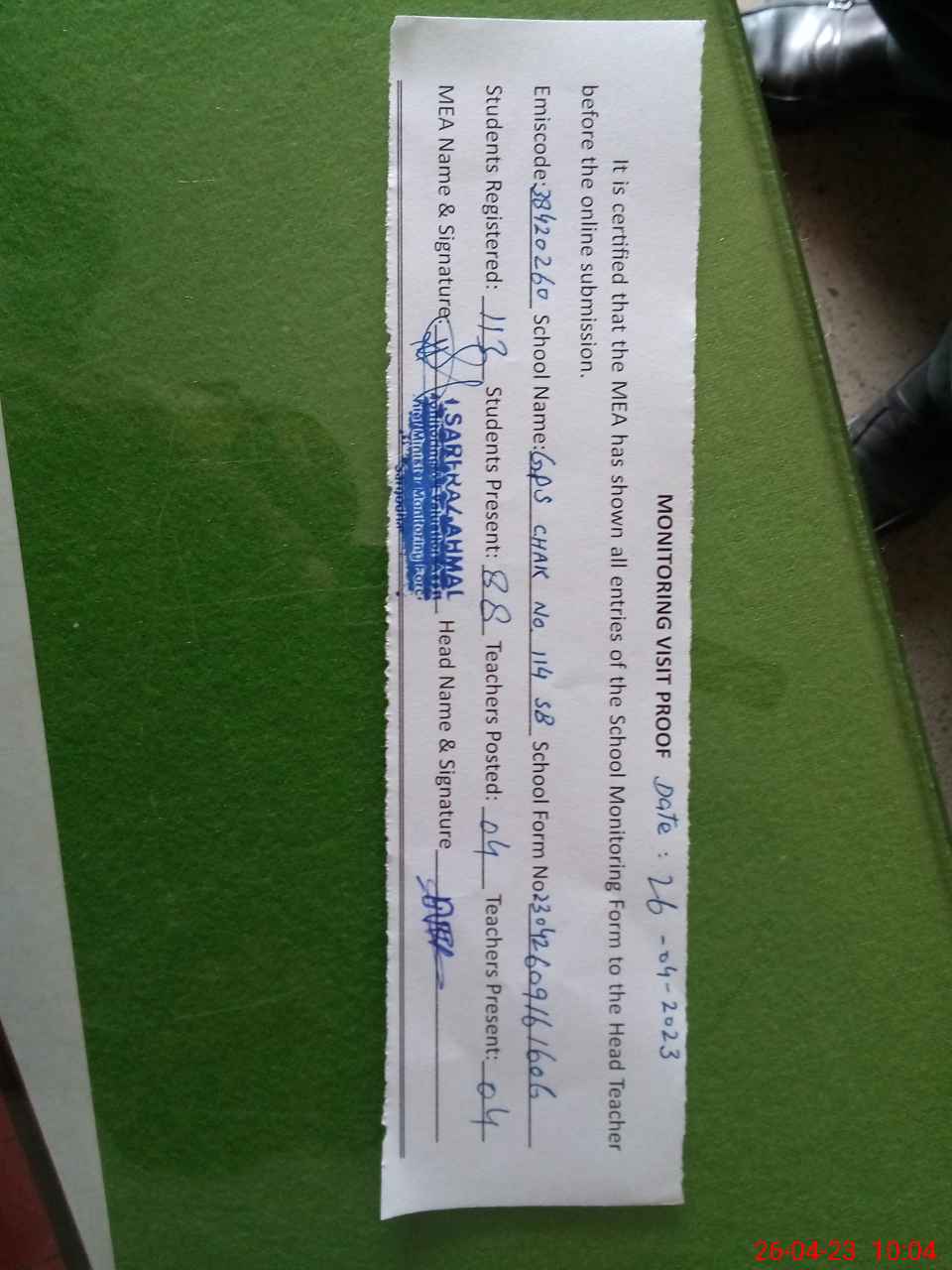 | EMIS Code: 38420260 | Name of School: GPS CHAK NO.114 SB | |||