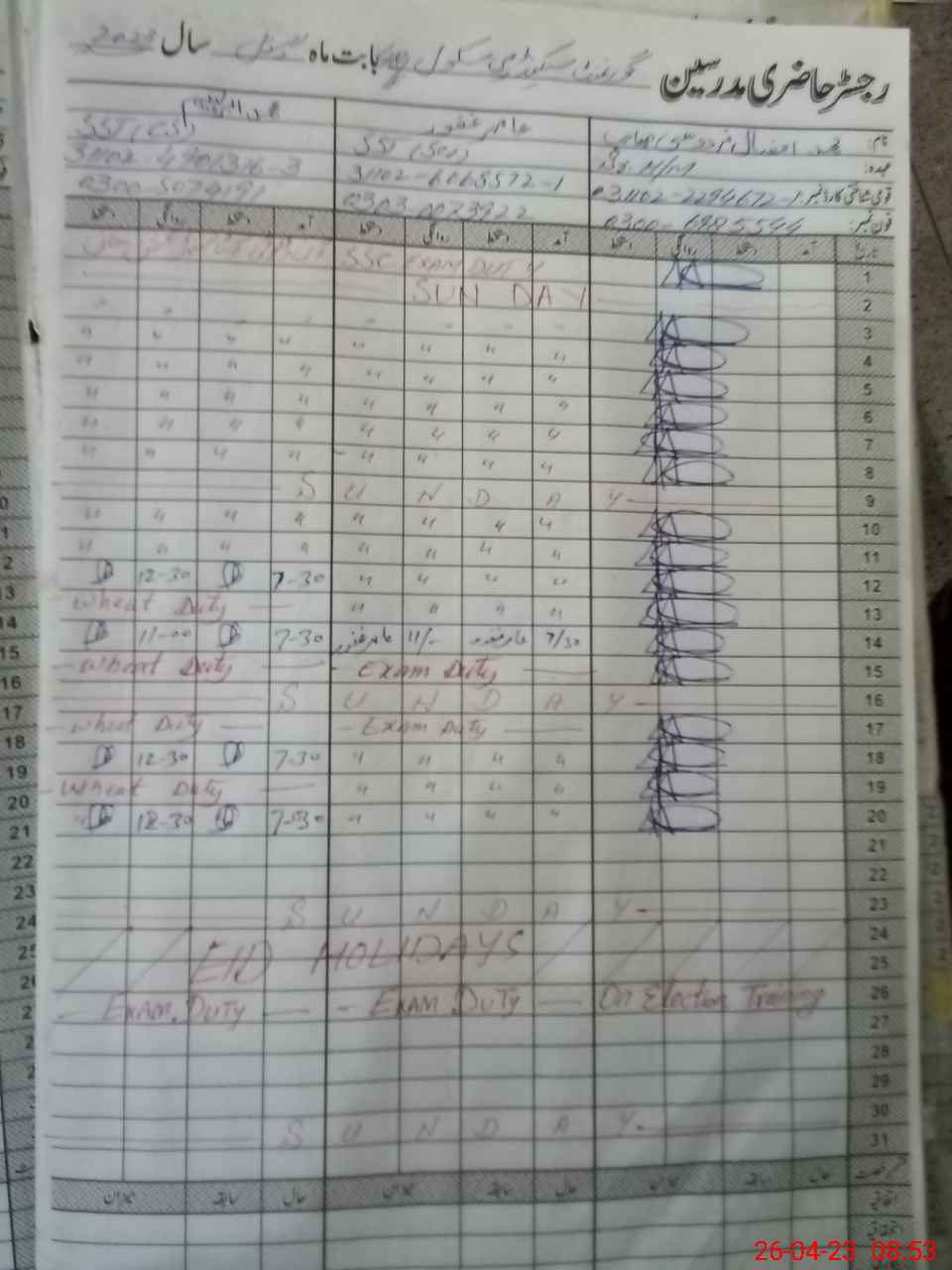 | 31**** | Mu**** Ar**** Kh**** | PST | Regular | 0 | 31 | 0 | 0 | 0 | 0 | 0 | 0 | 0 | Exam Duty |