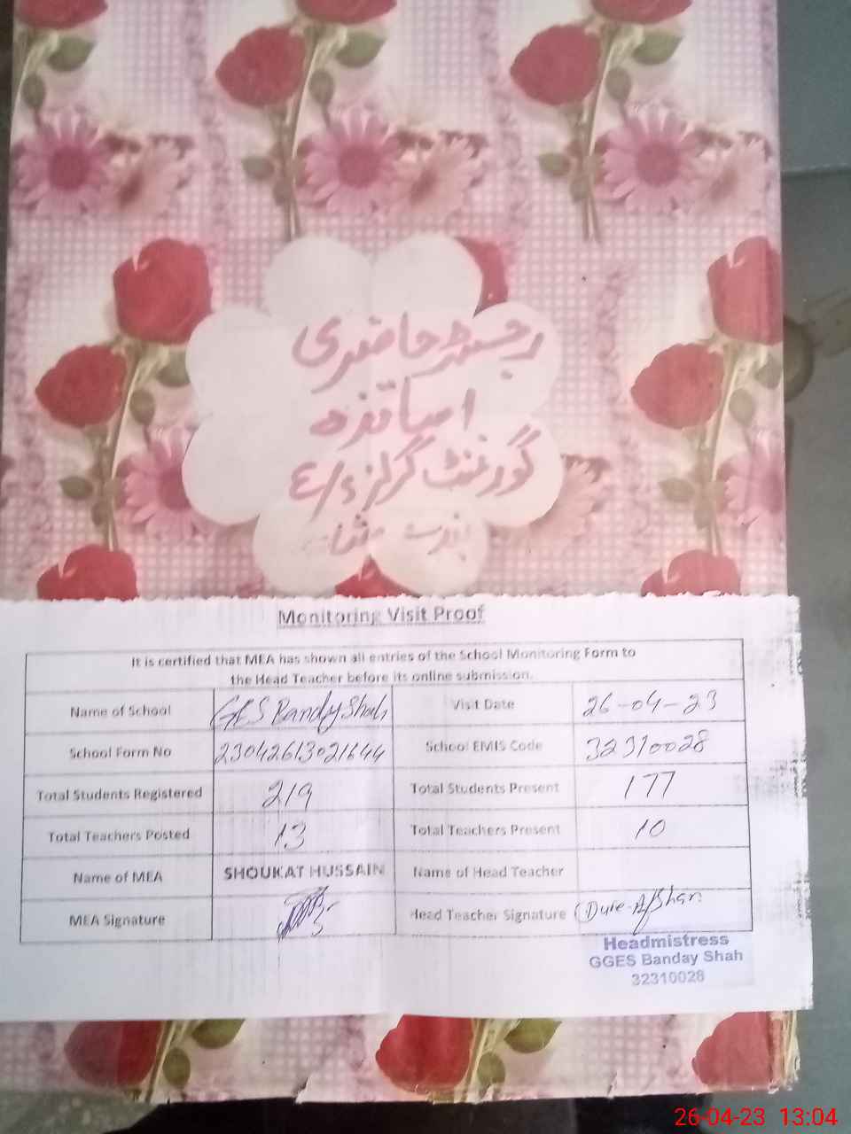 | EMIS Code: 32310028 | Name of School: GGES BANDAY SHAH | |||