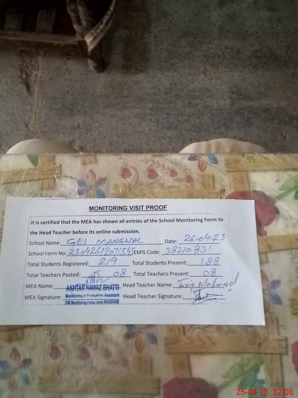 | Attendance Register | Head Teacher | MEA with School | Visit Proof |