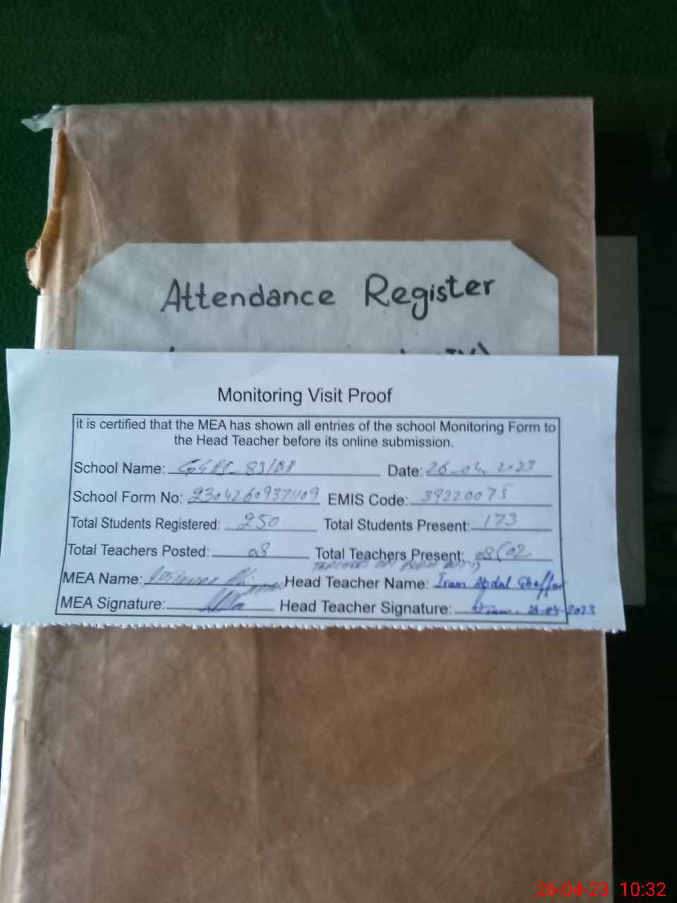 | Attendance Register | Head Teacher | MEA with School | Visit Proof |