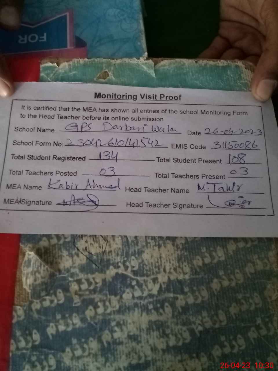 | Attendance Register | Head Teacher | MEA with School | Visit Proof |