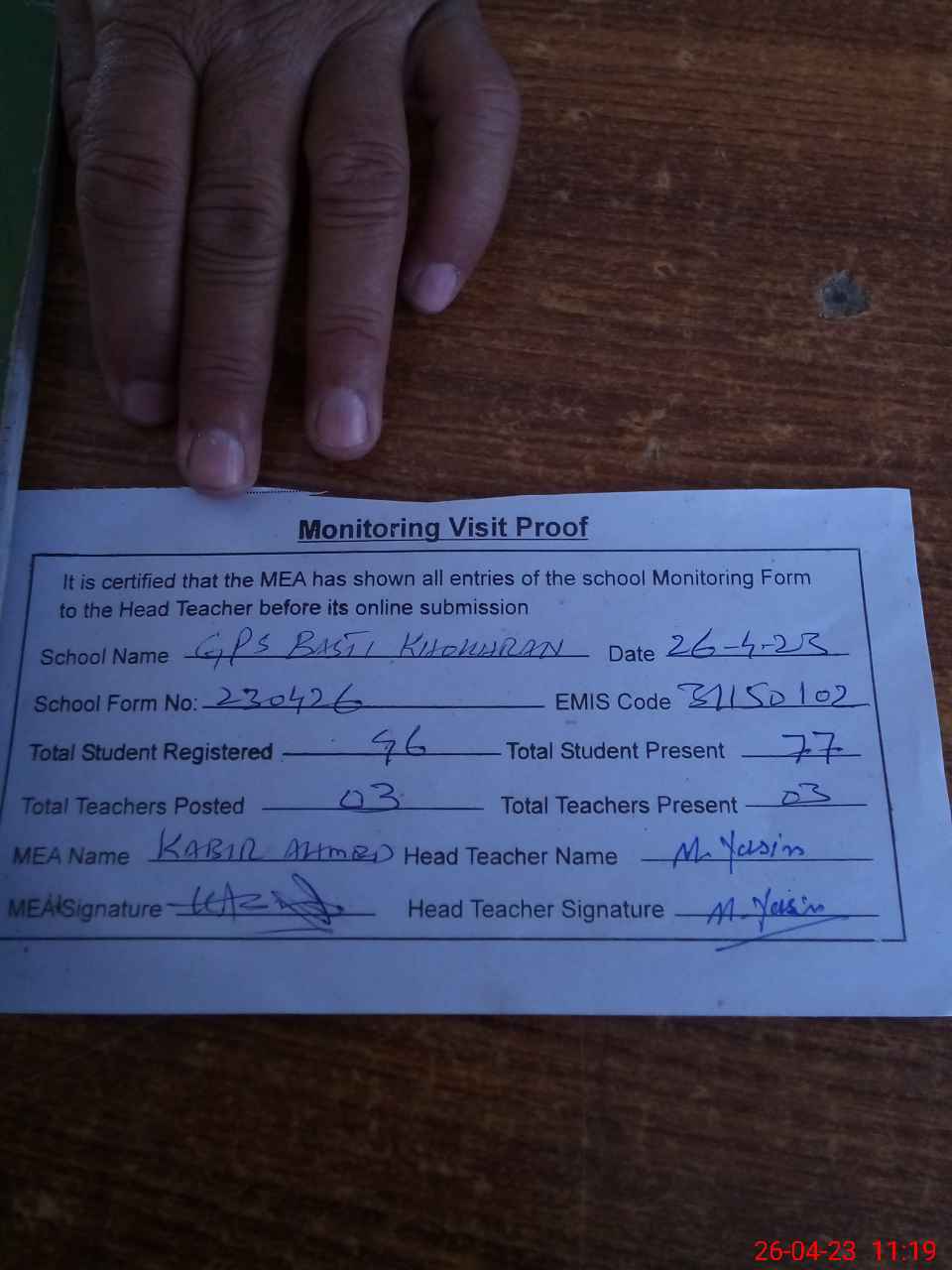 | Attendance Register | Head Teacher | MEA with School | Visit Proof |