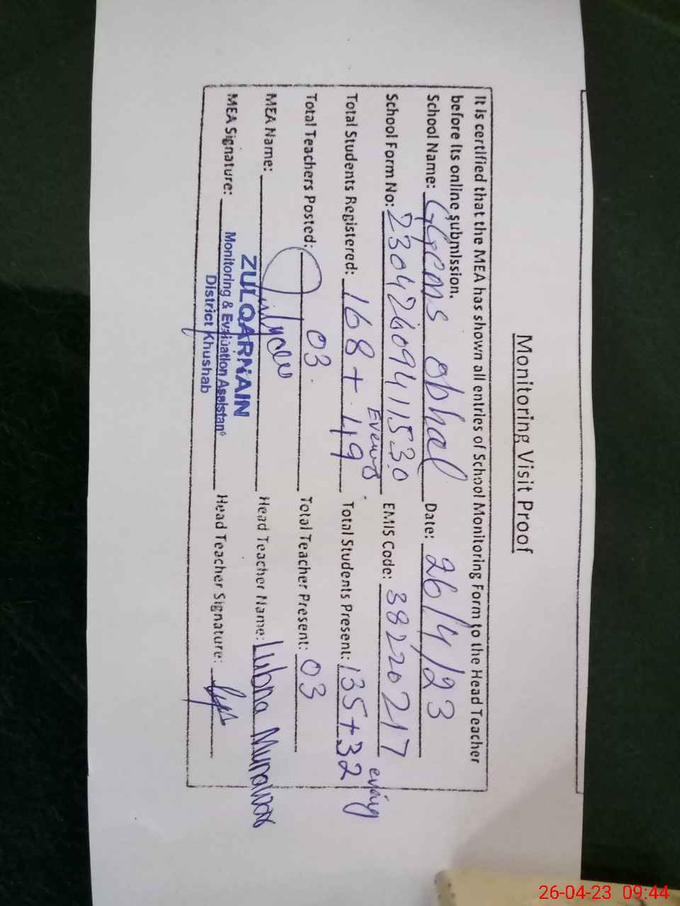 | Attendance Register | Head Teacher | MEA with School | Visit Proof |
