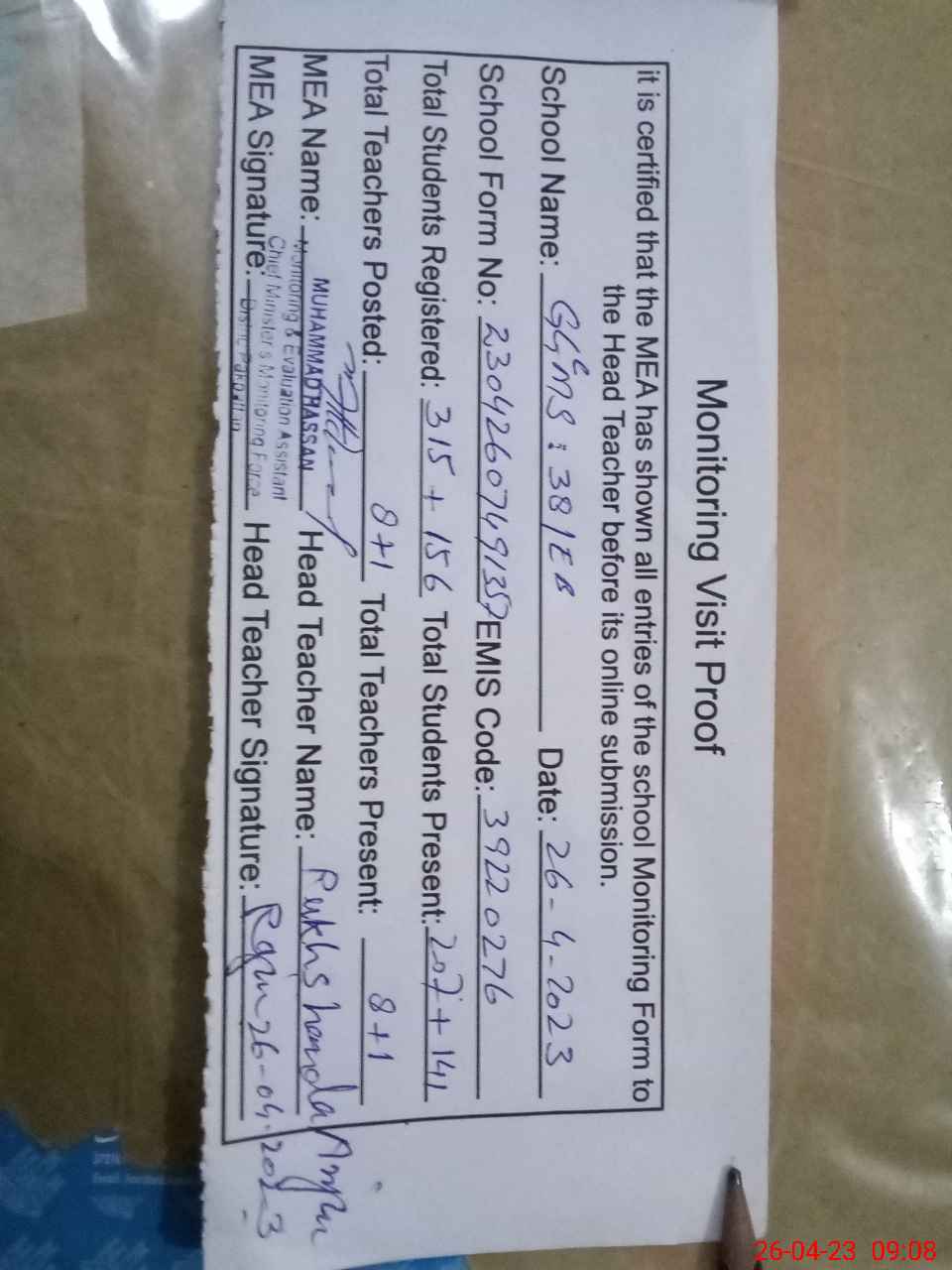 | Attendance Register | Head Teacher | MEA with School | Visit Proof |