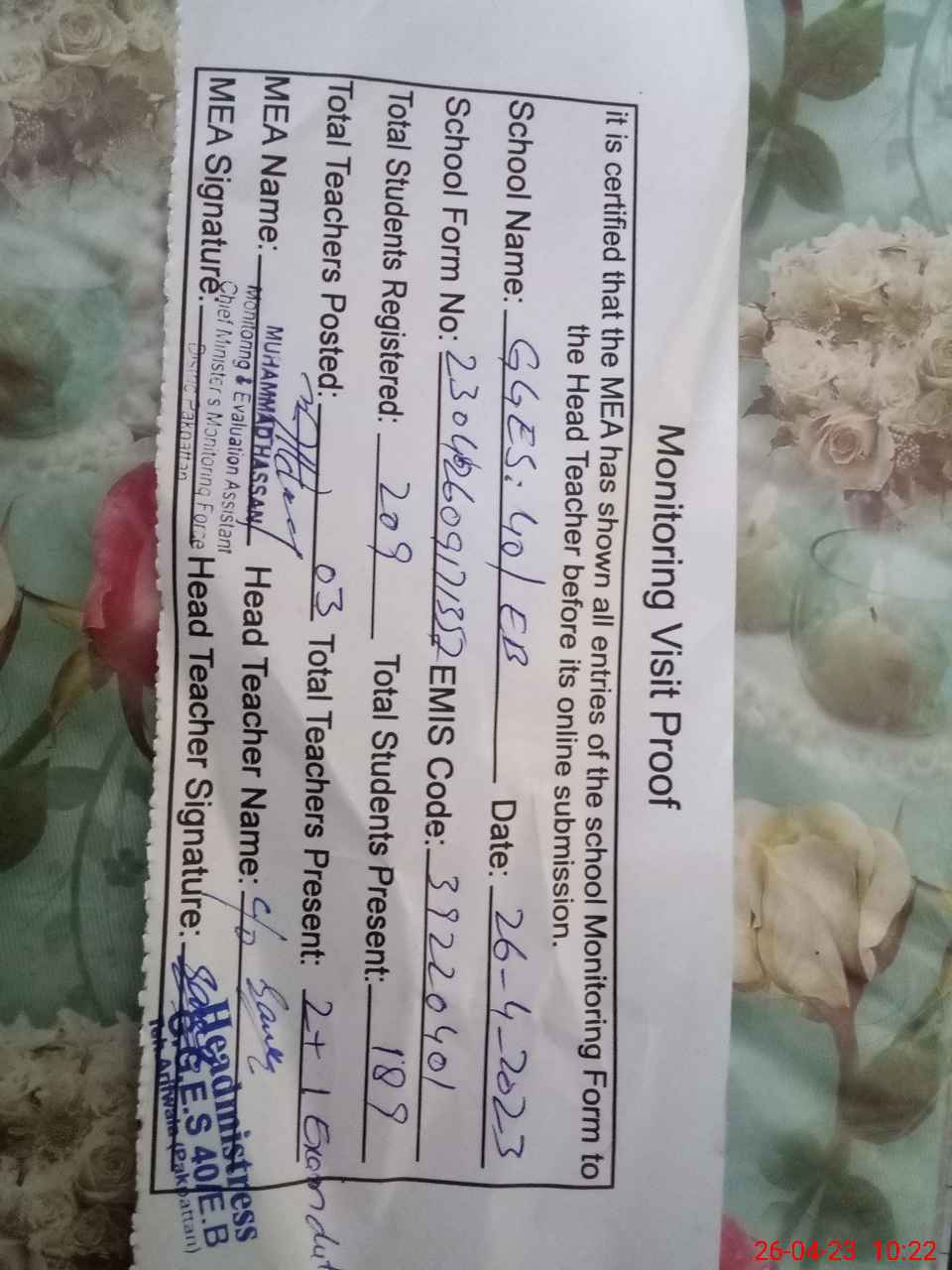 | EMIS Code: 39220401 | Name of School: GGES 40 EB PO 40 EB ARIF WALA | |||