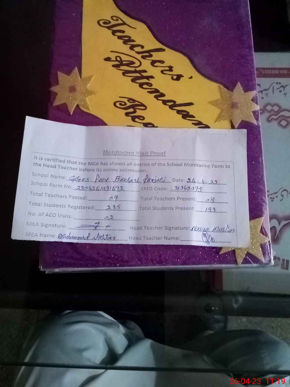 | Attendance Register | Head Teacher | MEA with School | Visit Proof |