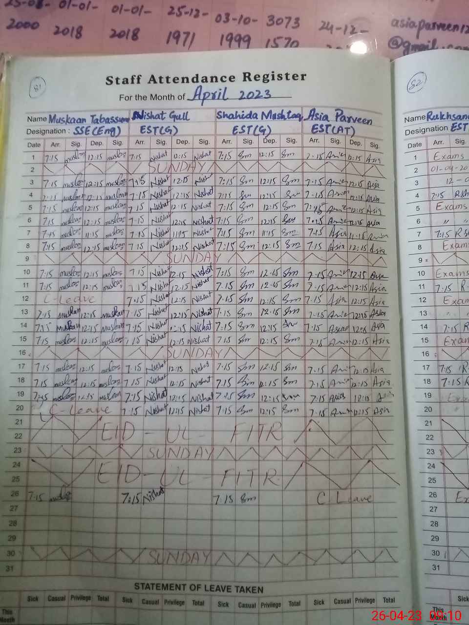 | 35**** | Ru**** Sh**** | Regular | 9 | 0 | 0 | 0 | 0 | 0 | 0 | 8 | 1 | Exam Duty | |