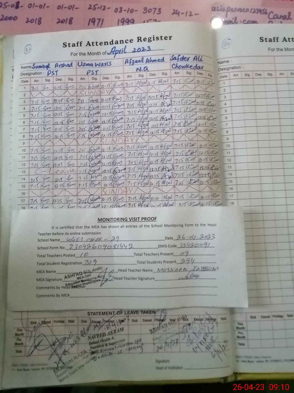 | Attendance Register | Head Teacher | MEA with School | Visit Proof |