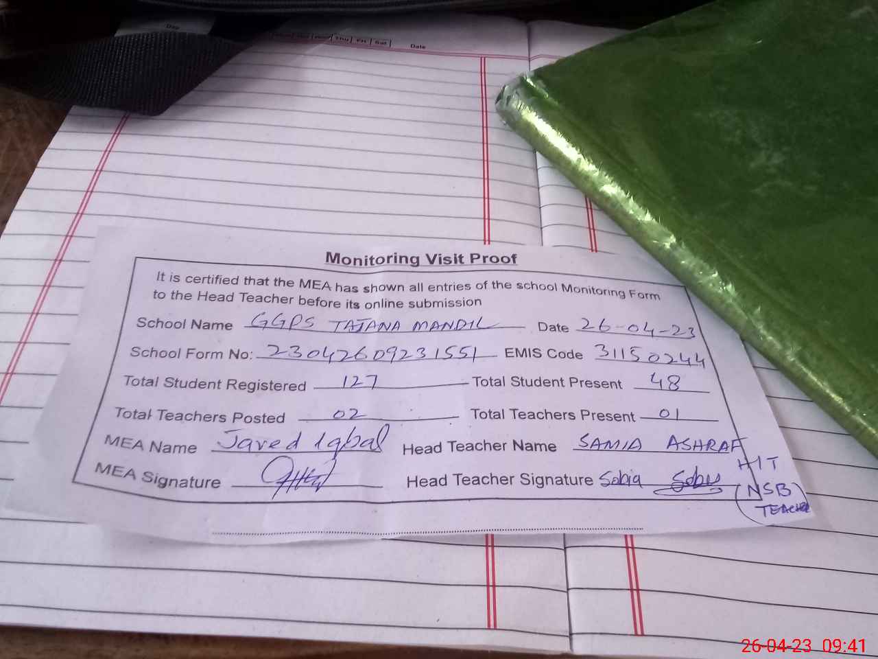 | Attendance Register | Head Teacher | MEA with School | Visit Proof |