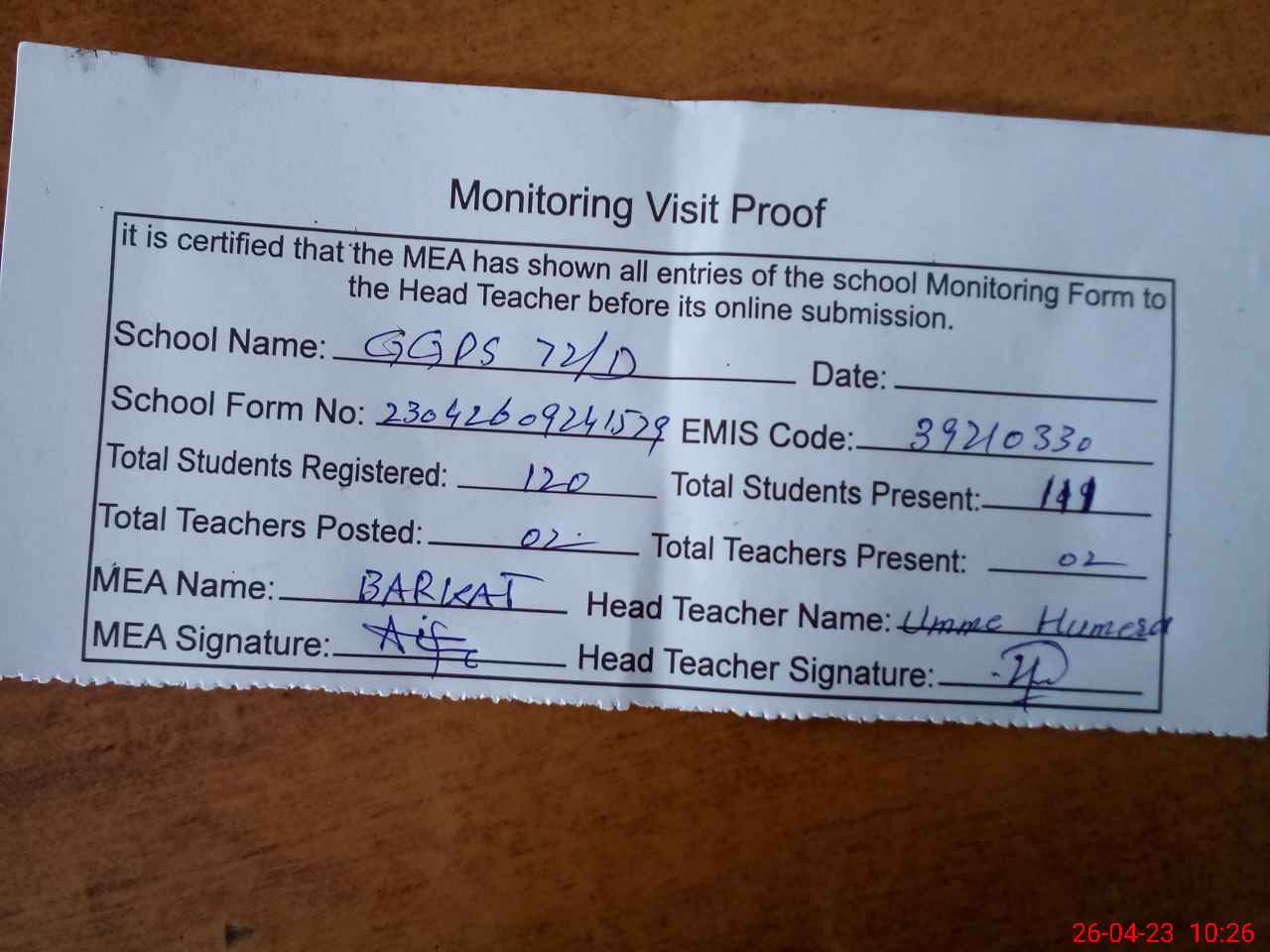 | Attendance Register | Head Teacher | MEA with School | Visit Proof |