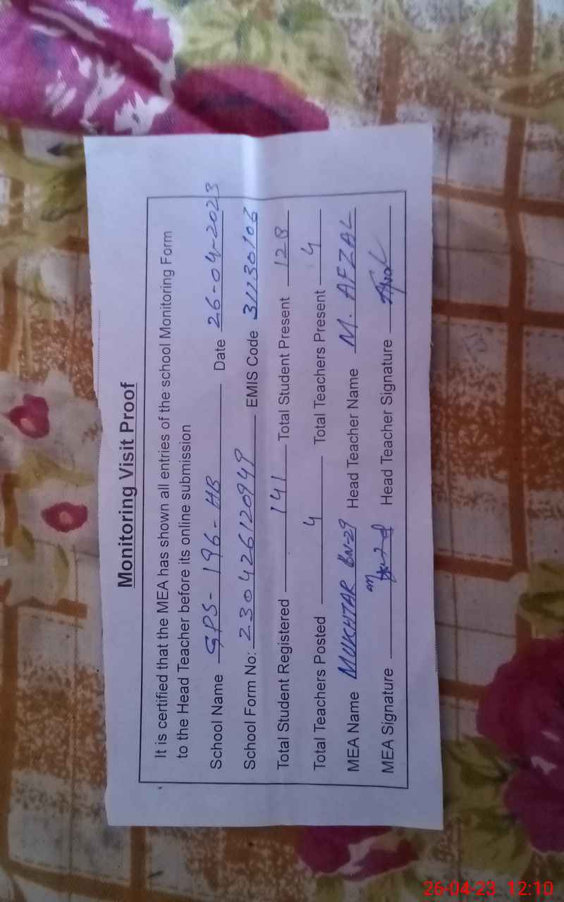 | Attendance Register | Head Teacher | MEA with School | Visit Proof |