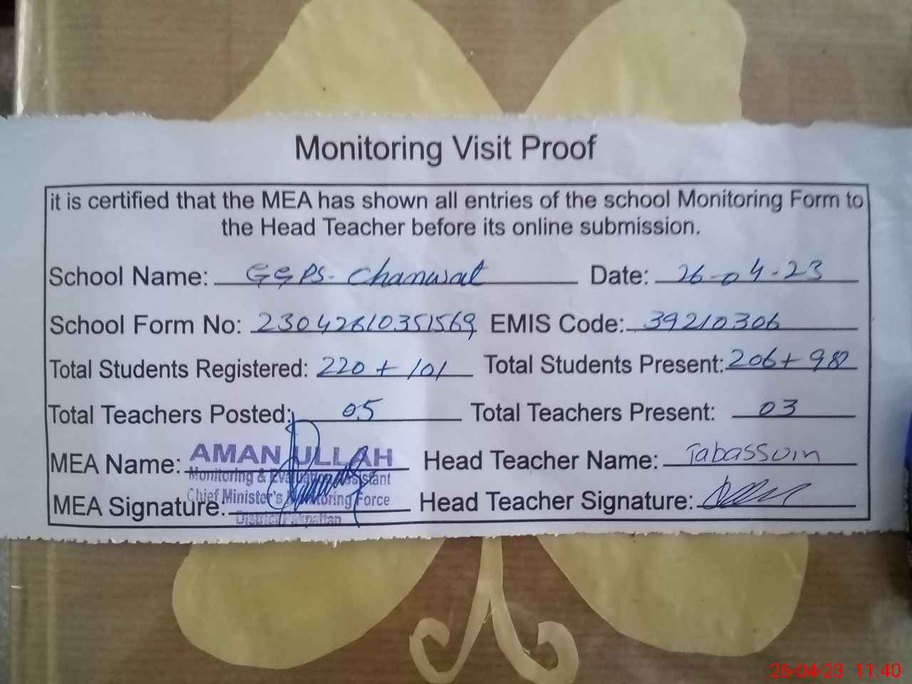| Attendance Register | Head Teacher | MEA with School | Visit Proof |