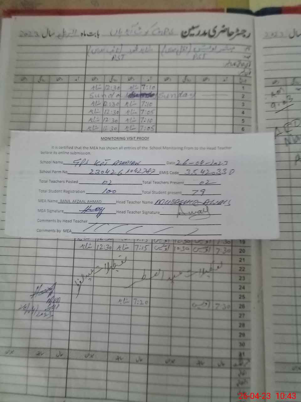 | Attendance Register | Head Teacher | MEA with School | Visit Proof |