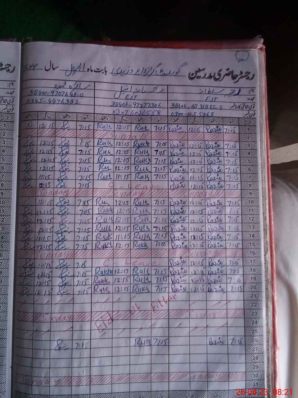 | 38**** | Gh**** Ka**** | PST | Regular | 0 | 0 | 0 | 0 | 0 | 0 | 0 | 0 | 0 | Exam Duty |