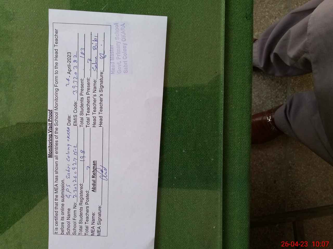 | Attendance Register | Head Teacher | MEA with School | Visit Proof |