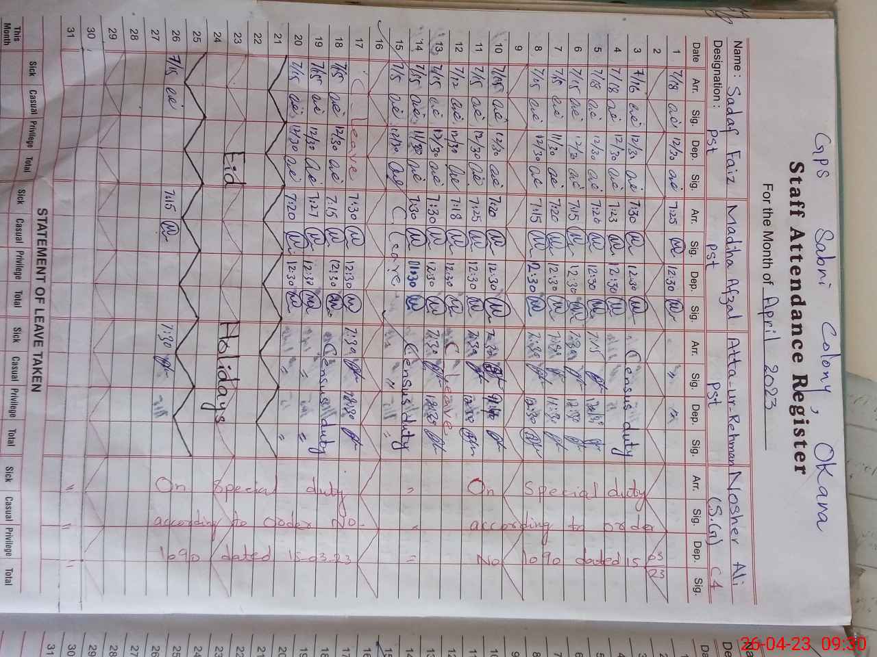 | CNIC | Full Name | Designation | R/C | Absence During Last Calender Month |