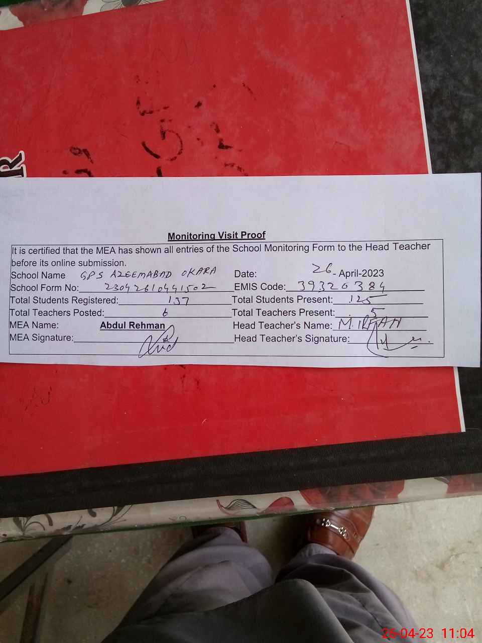 | EMIS Code: 39320384 | Name of School: GPS AZEEM ABAD , OKARA | |||