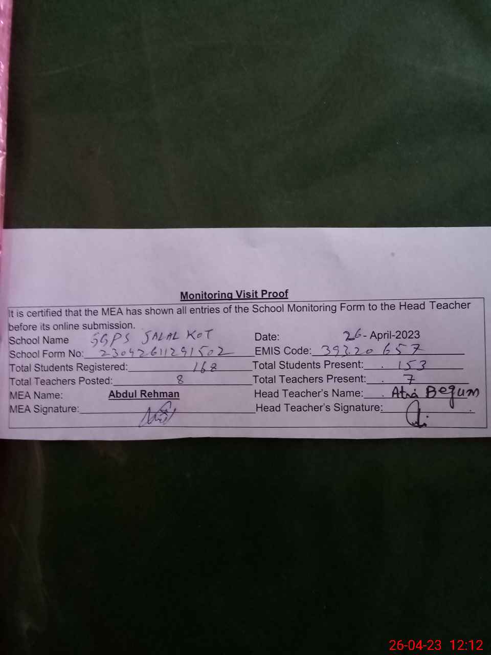 | Attendance Register | Head Teacher | MEA with School | Visit Proof |