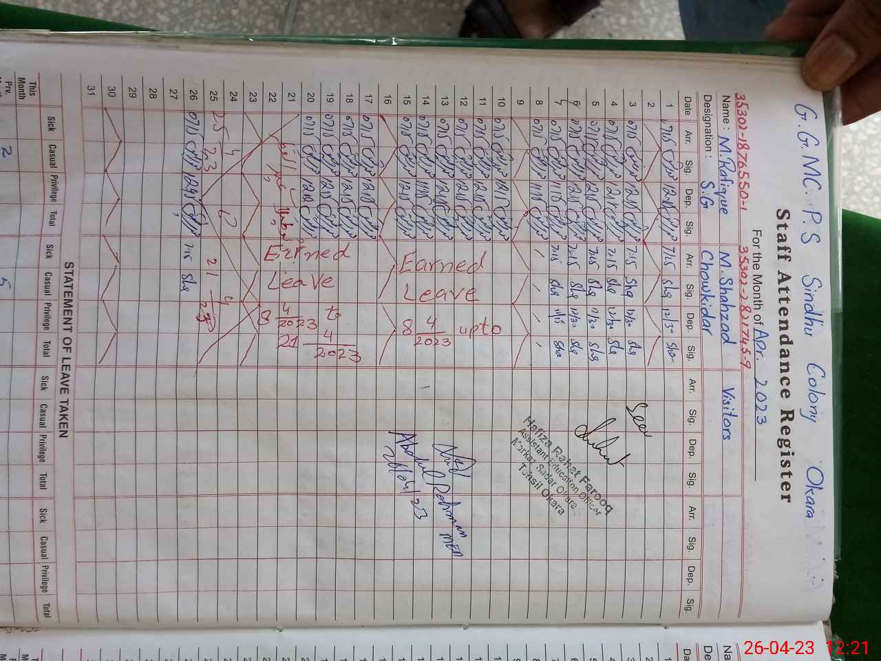 | CNIC | Full Name | Designation | R/C | Absence During Last Calender Month |
