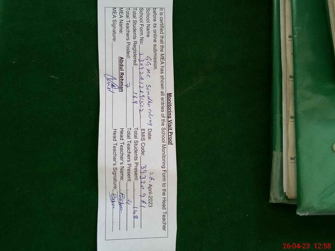 | Attendance Register | Head Teacher | MEA with School | Visit Proof |