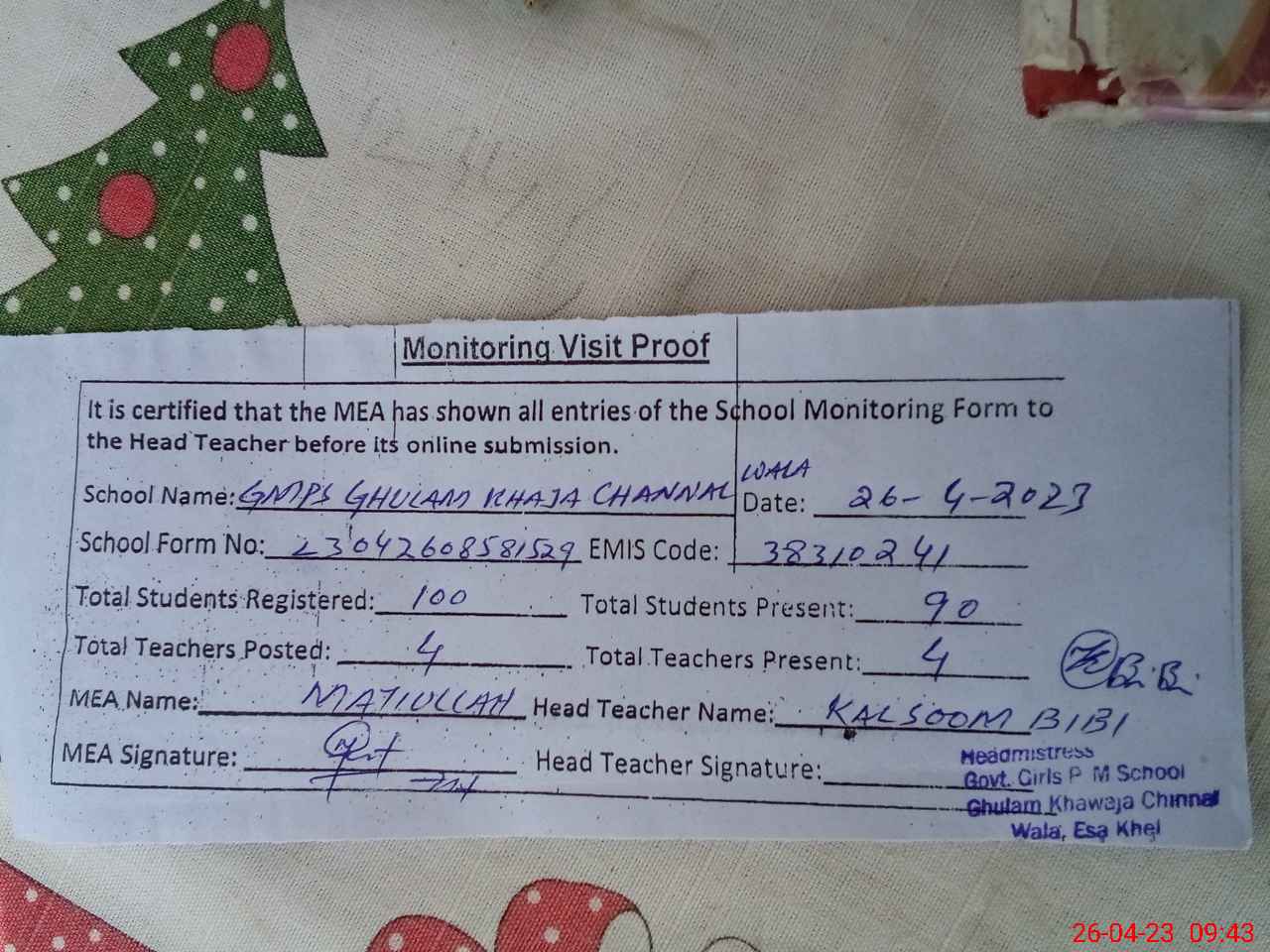 | Attendance Register | Head Teacher | MEA with School | Visit Proof |