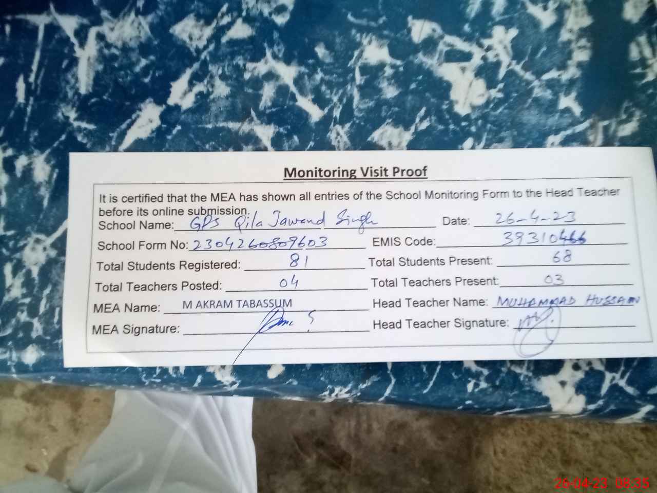 | Attendance Register | Head Teacher | MEA with School | Visit Proof |