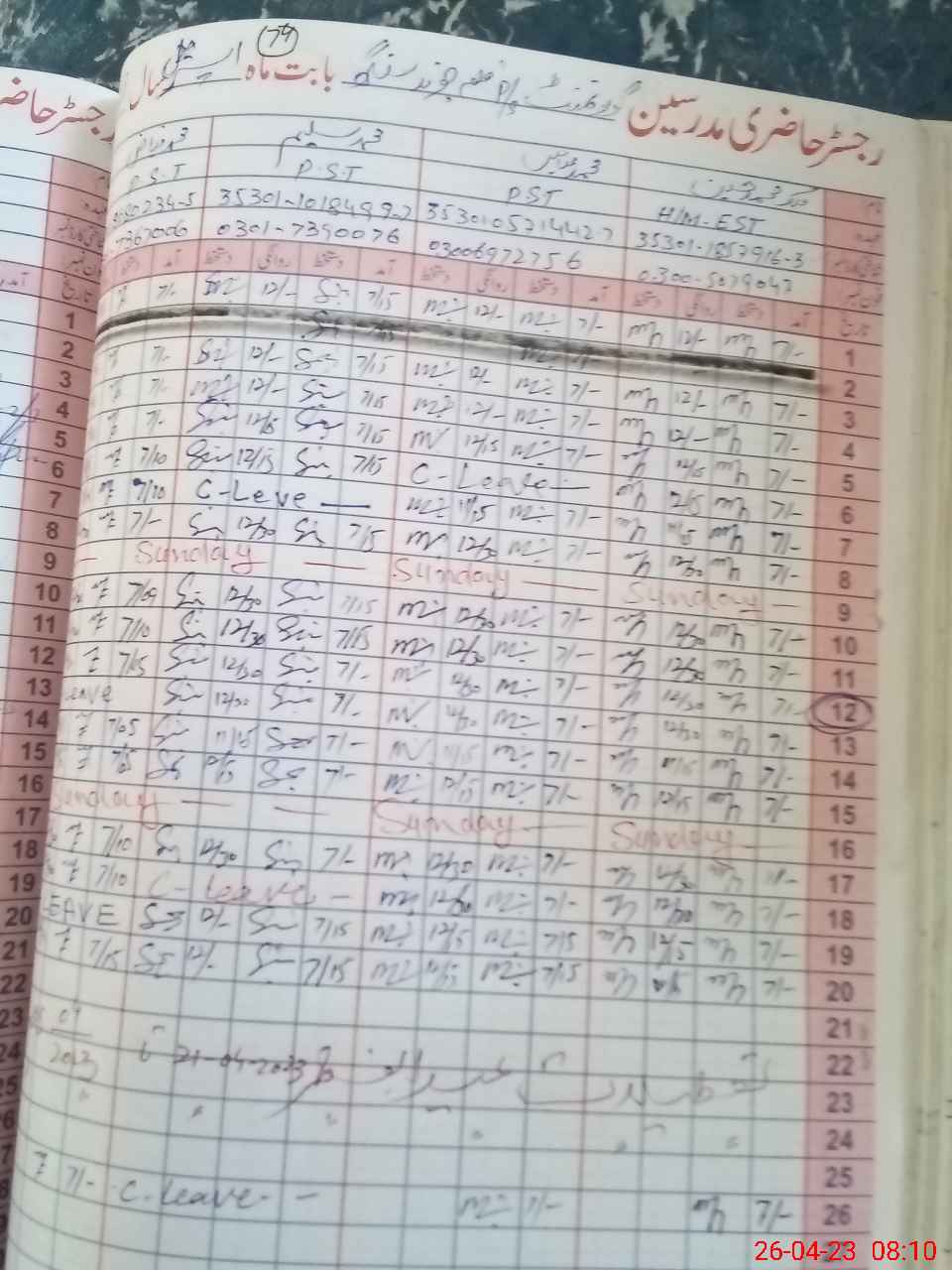 | CNIC | Full Name | Designation | R/C | Absence During Last Calender Month |