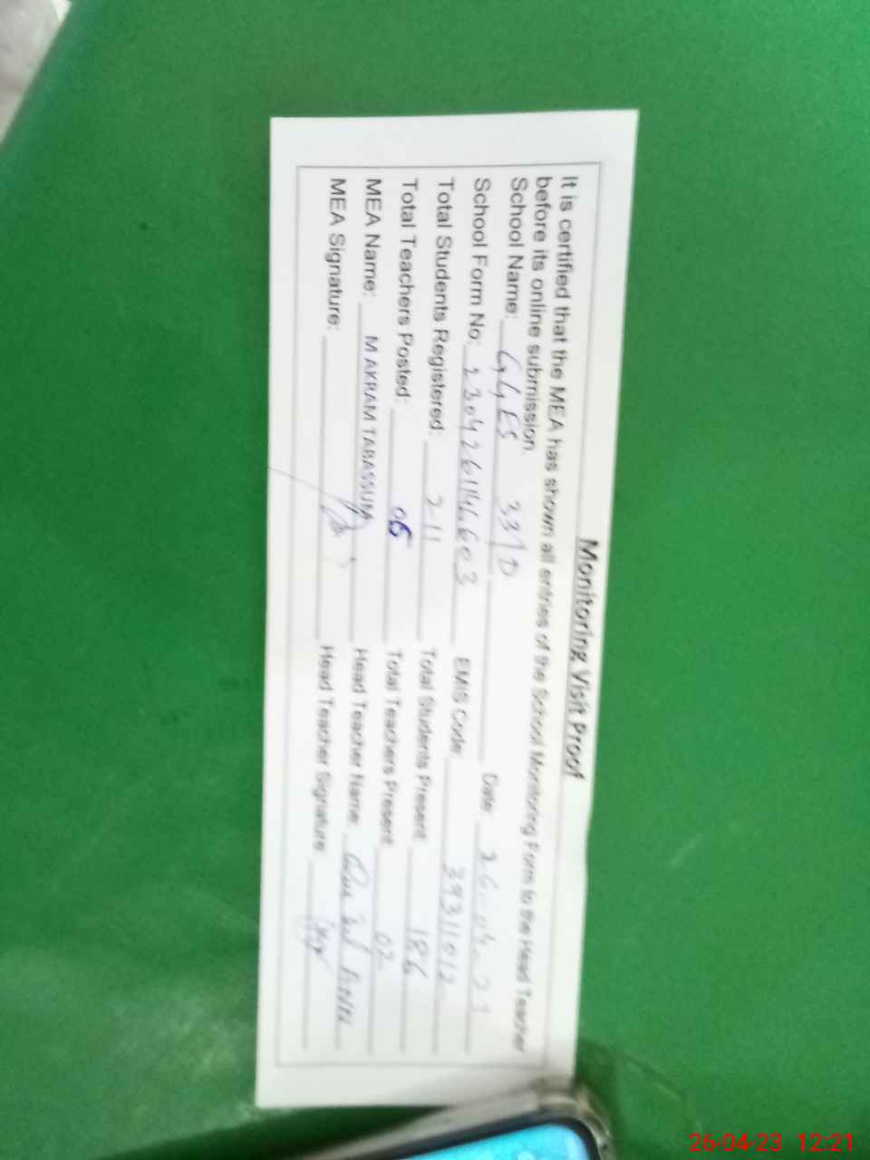 | Attendance Register | Head Teacher | MEA with School | Visit Proof |