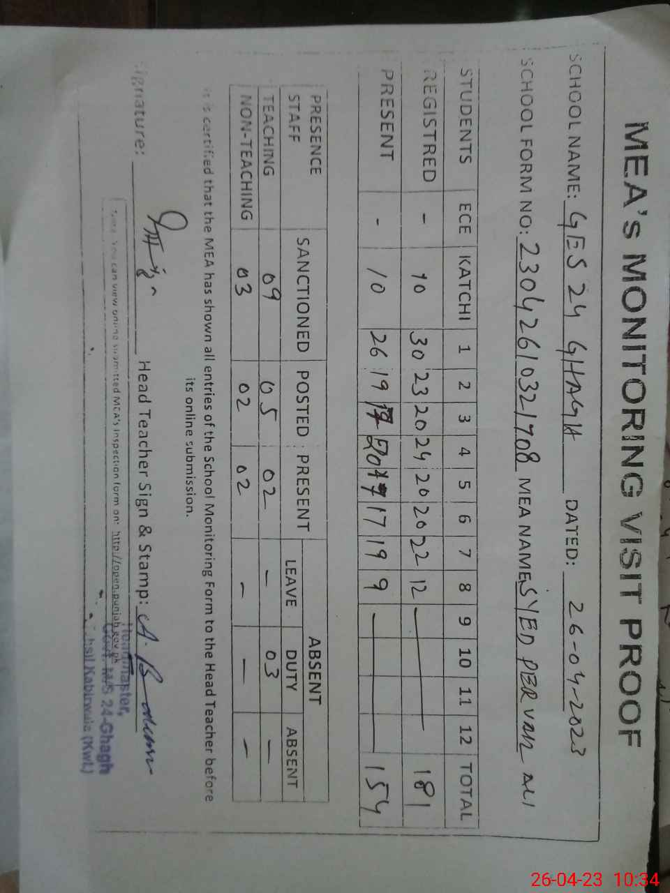 | Attendance Register | Head Teacher | MEA with School | Visit Proof |