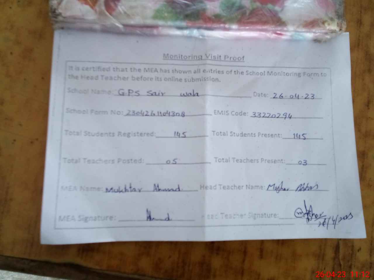 | EMIS Code: 33220294 | Name of School: GPS SAIR WALA | |||