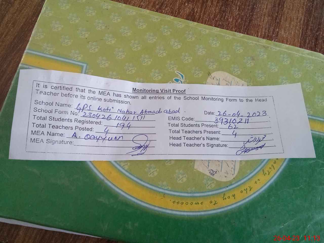 | Attendance Register | Head Teacher | MEA with School | Visit Proof |