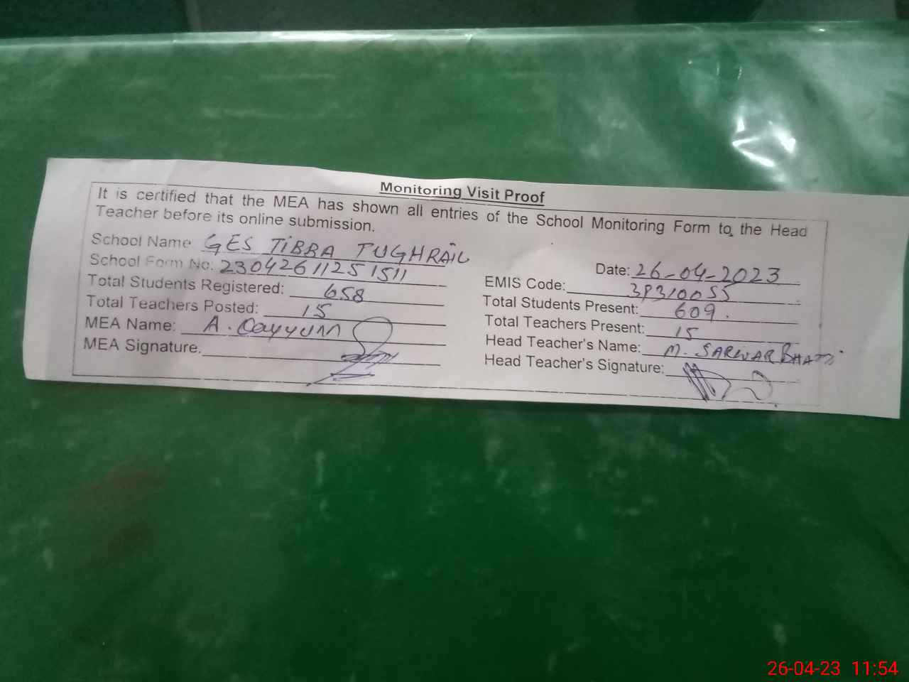 | Attendance Register | Head Teacher | MEA with School | Visit Proof |