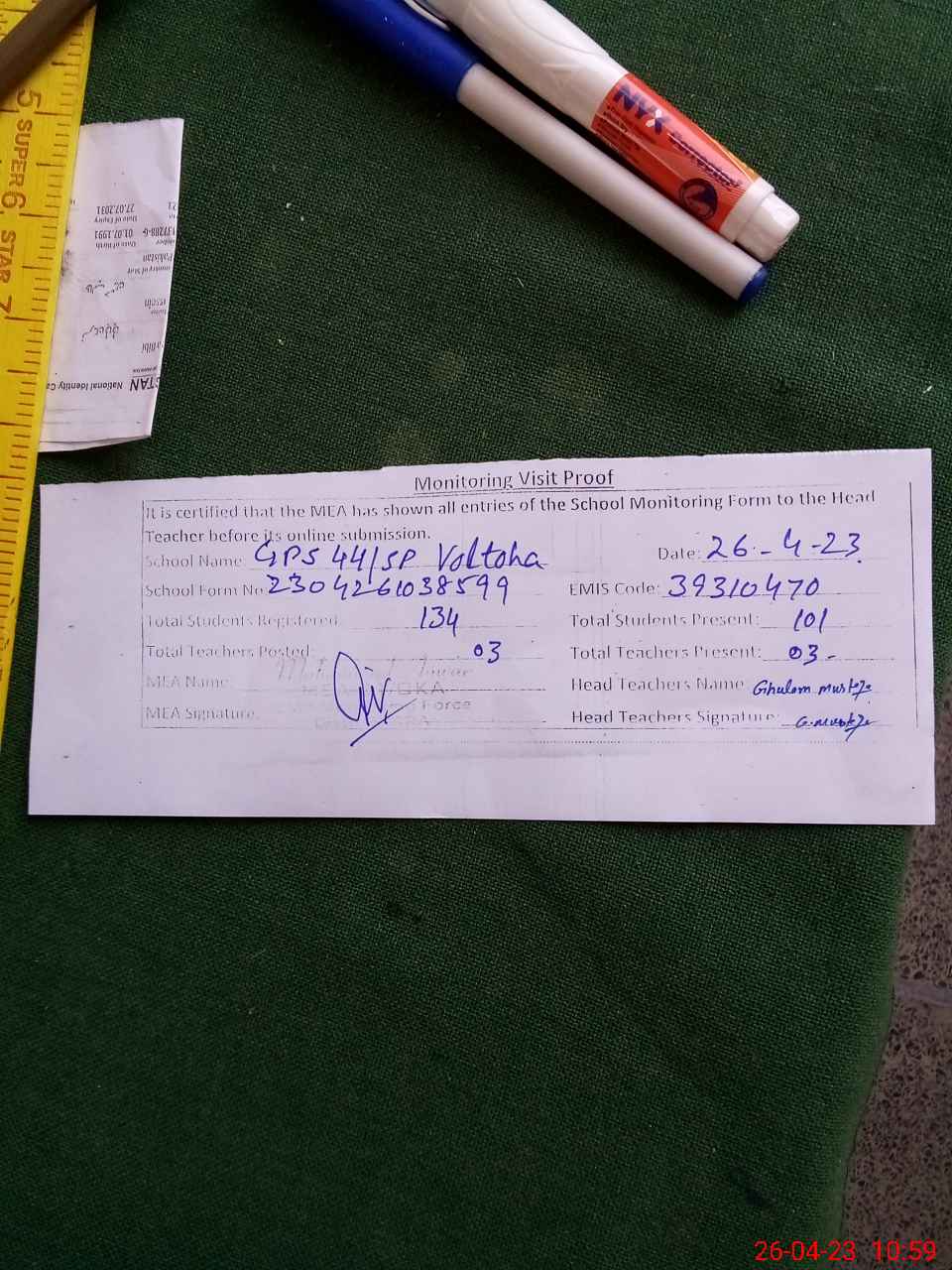 | Attendance Register | Head Teacher | MEA with School | Visit Proof |