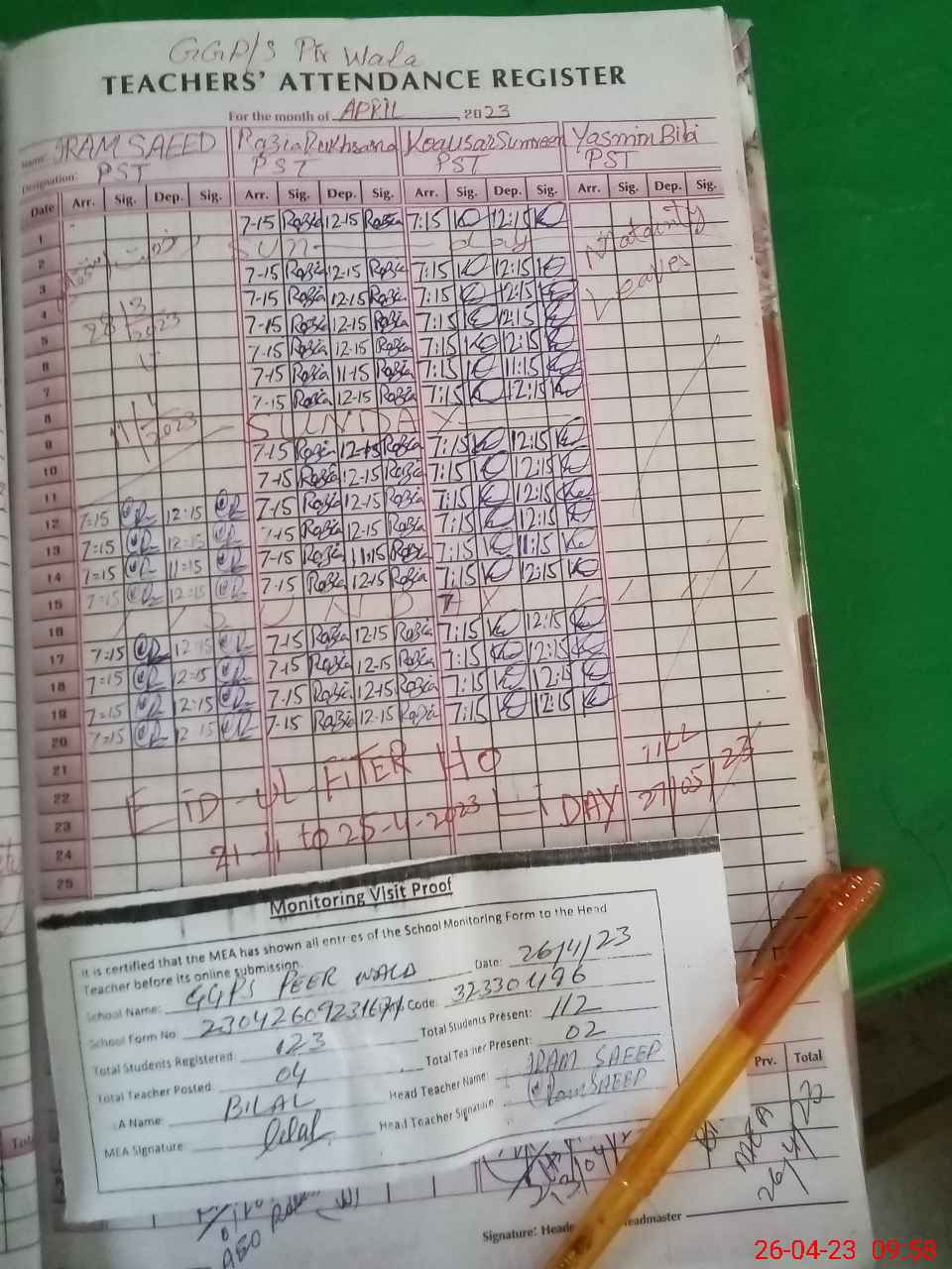 | Attendance Register | Head Teacher | MEA with School | Visit Proof |