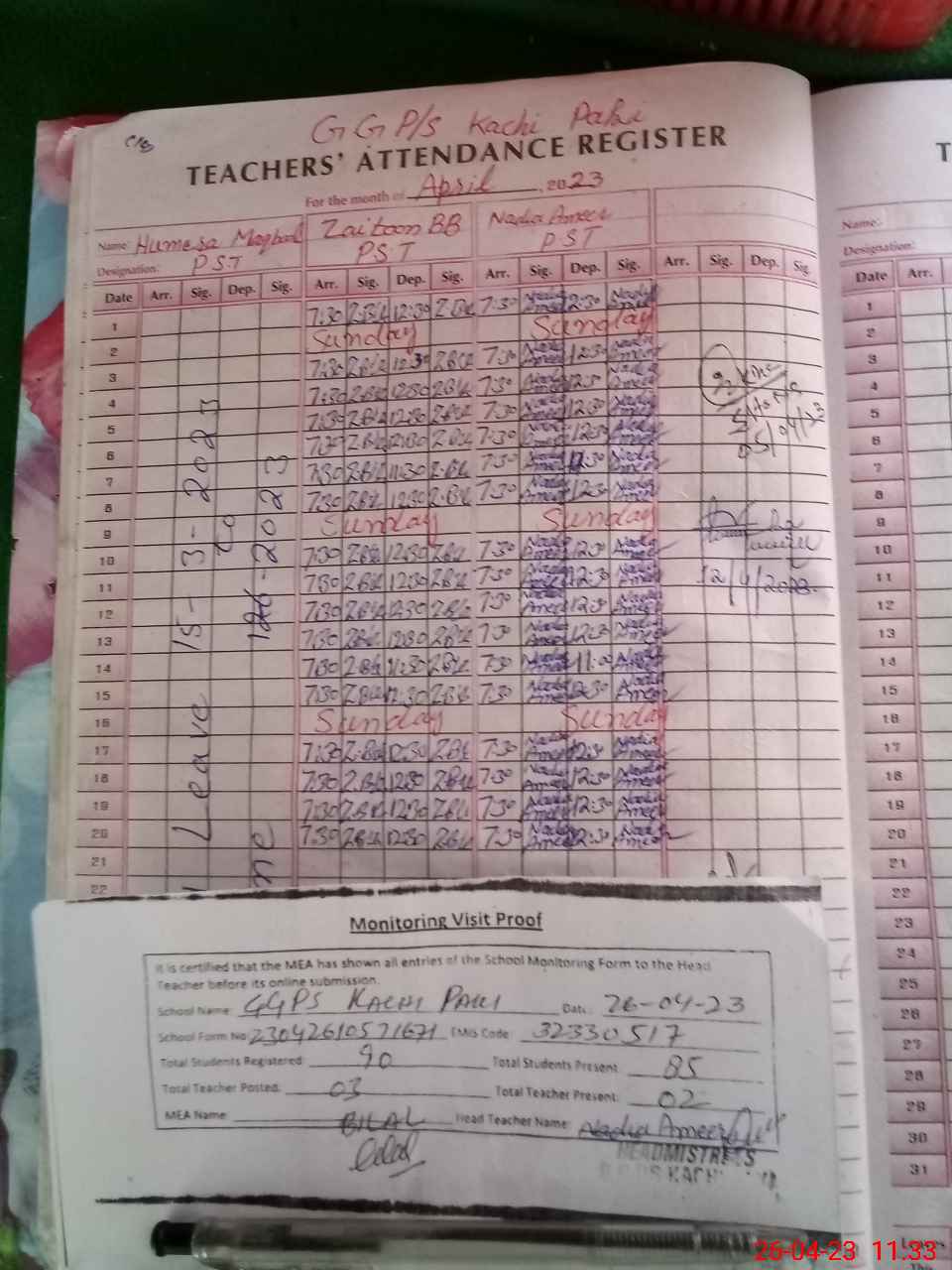 | Attendance Register | Head Teacher | MEA with School | Visit Proof |