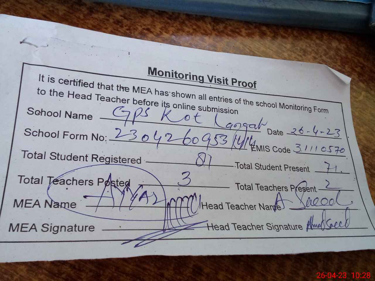 | Attendance Register | Head Teacher | MEA with School | Visit Proof |