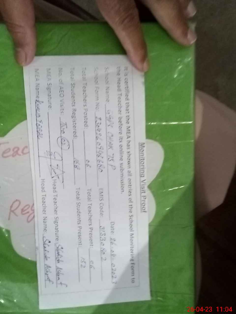 | Attendance Register | Head Teacher | MEA with School | Visit Proof |
