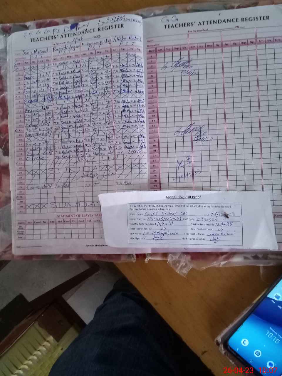 | Attendance Register | Head Teacher | MEA with School | Visit Proof |