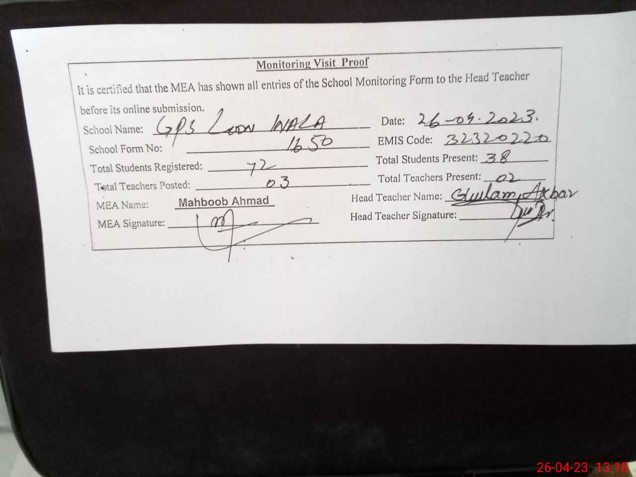 | EMIS Code: 32320220 | Name of School: GPS LOON WALA | |||