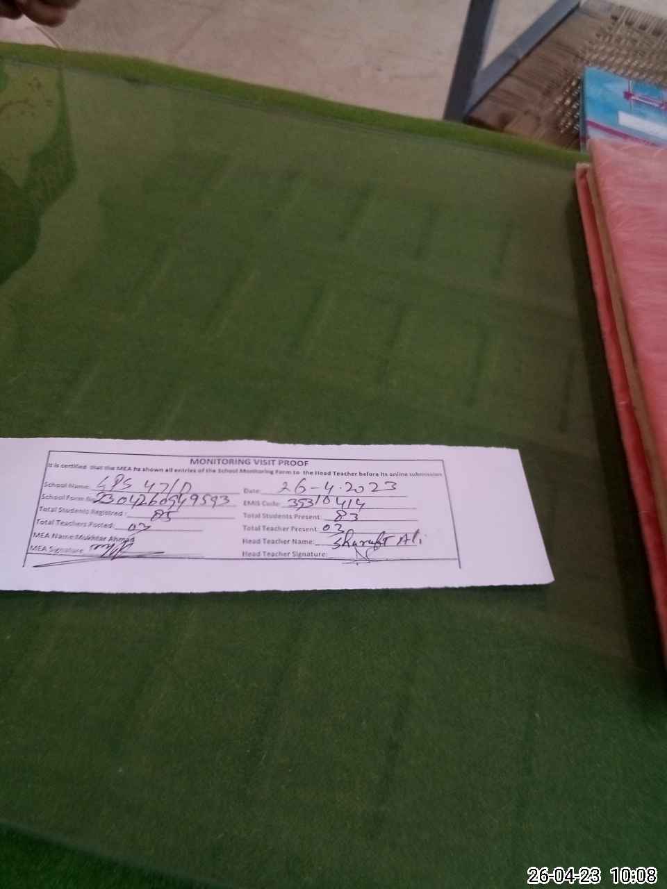 | Attendance Register | Head Teacher | MEA with School | Visit Proof |