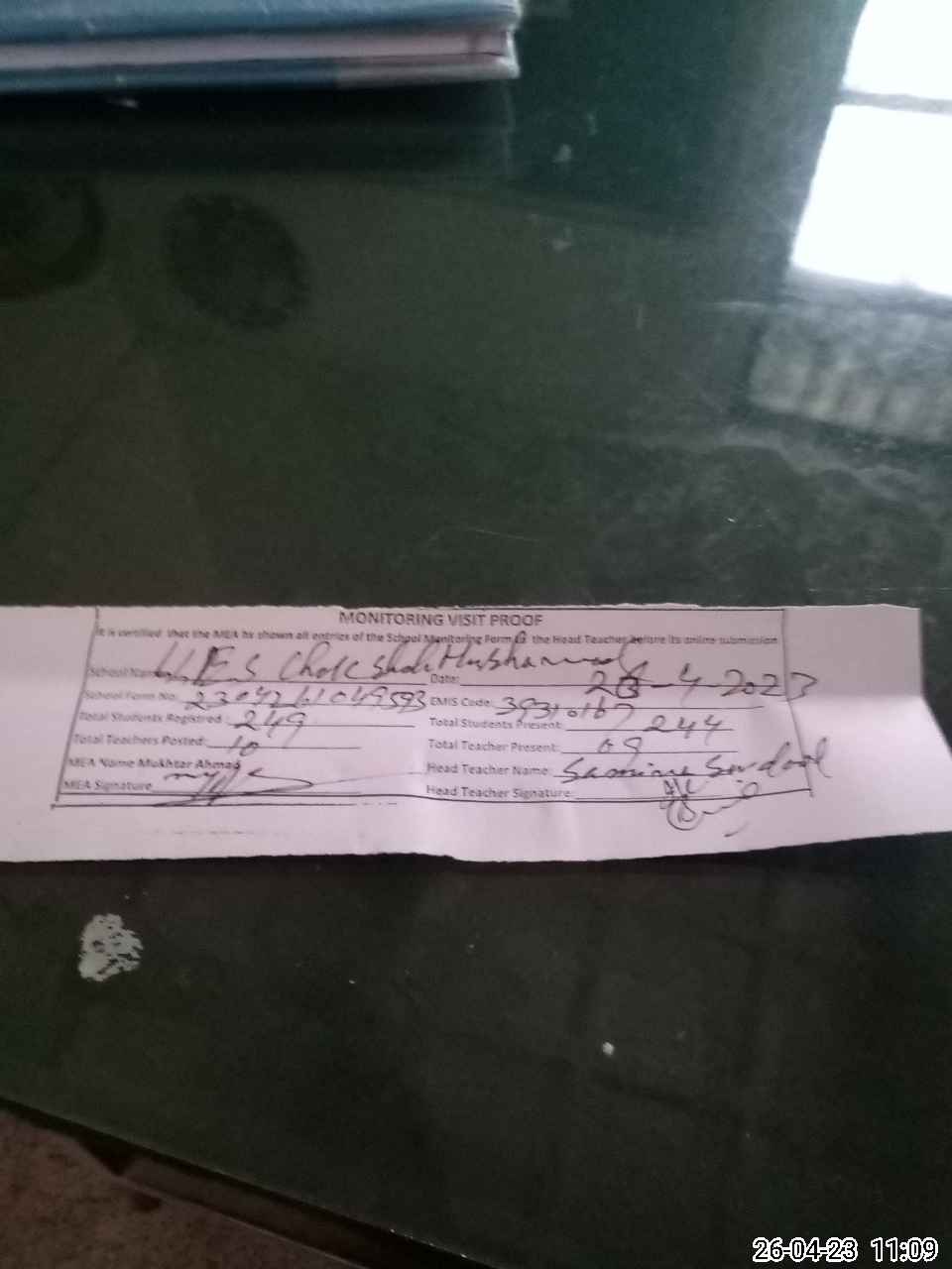 | Attendance Register | Head Teacher | MEA with School | Visit Proof |