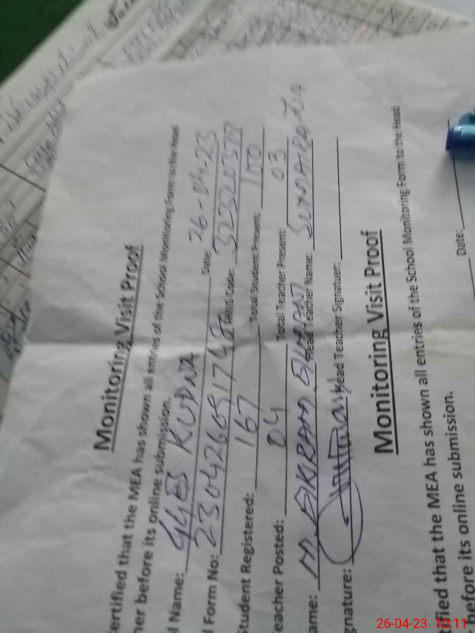| Attendance Register | Head Teacher | MEA with School | Visit Proof |