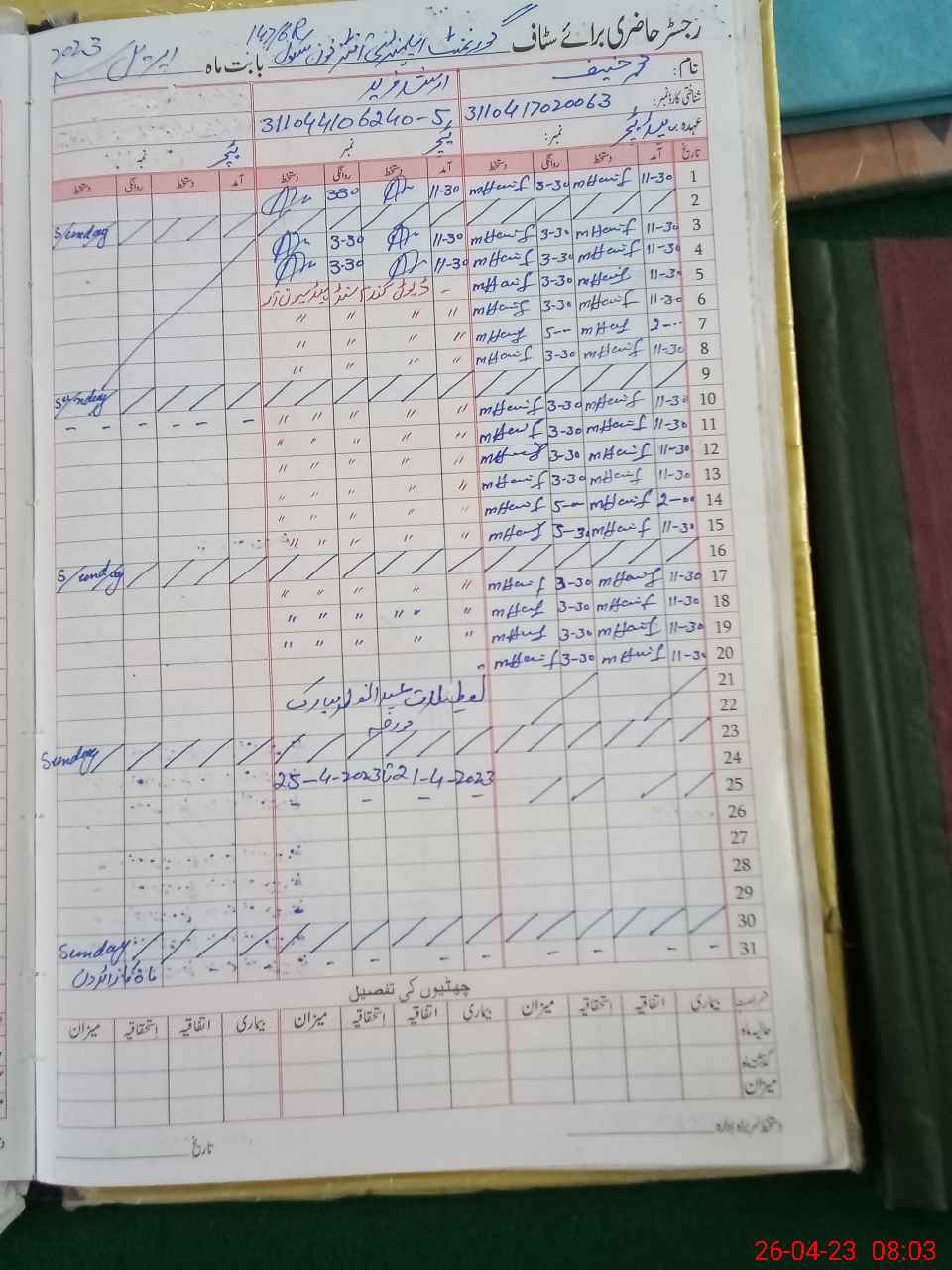 | CNIC | Full Name | Designation | R/C | Absence During Last Calender Month |